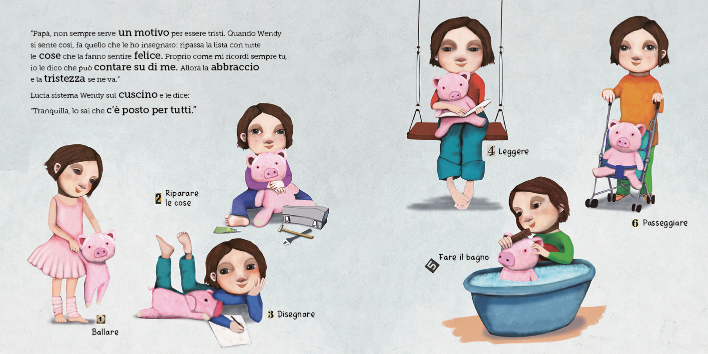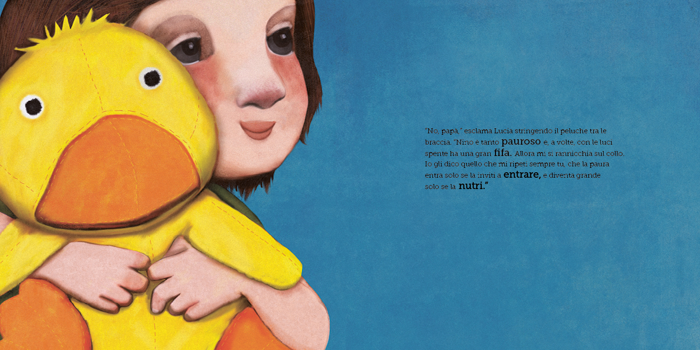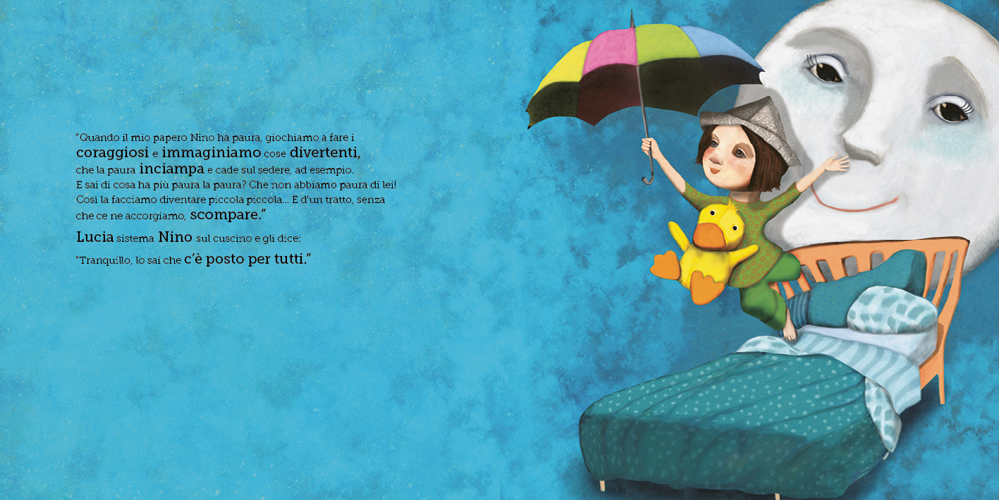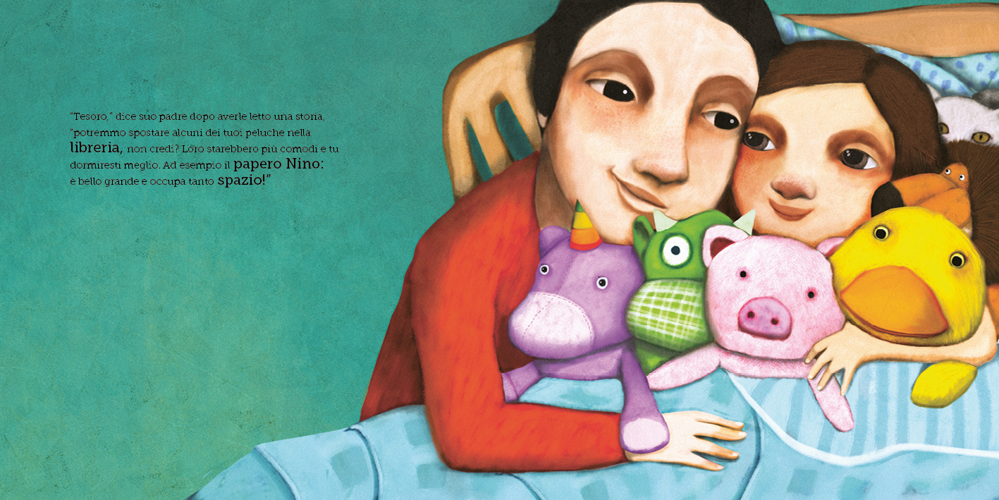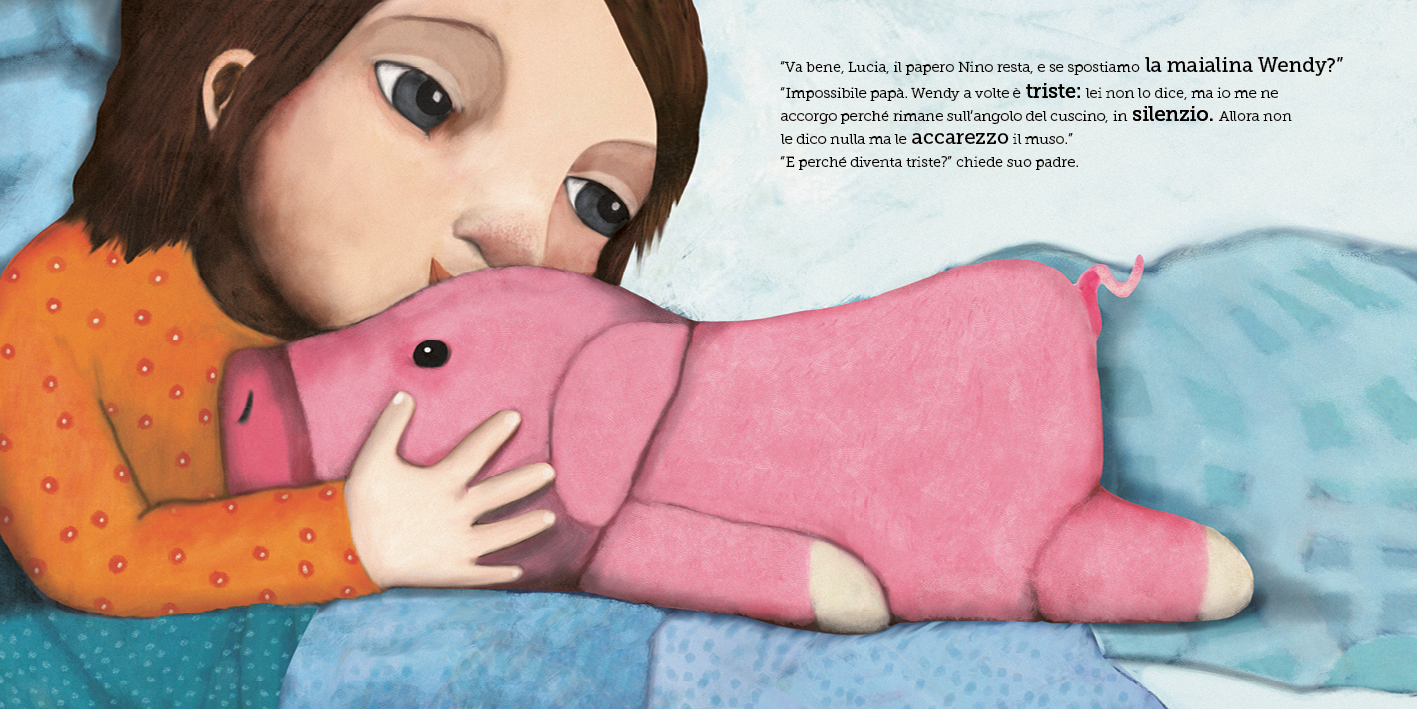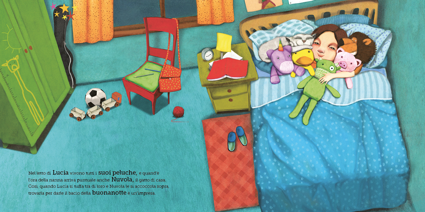 Lucia dorme con tutti i suoi peluche e il suo gatto Nuvola. Quando si mette a letto, ci sono così tanti peluche che la si vede appena. L’importante per lei è che nessuno resti solo.